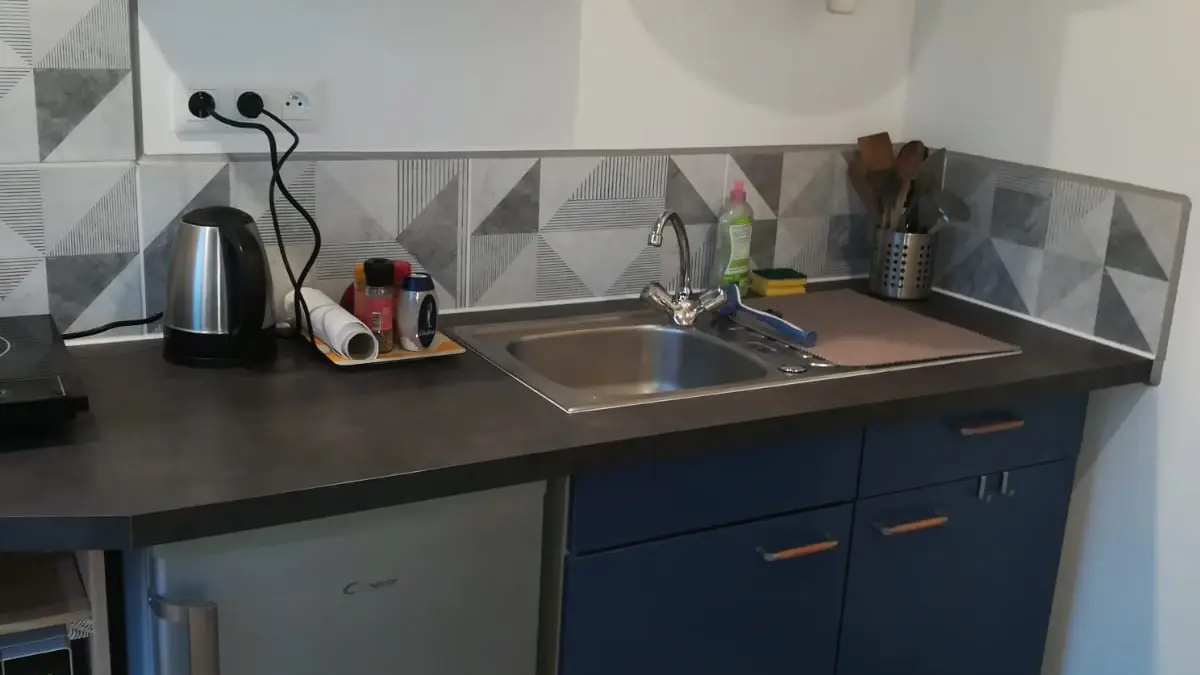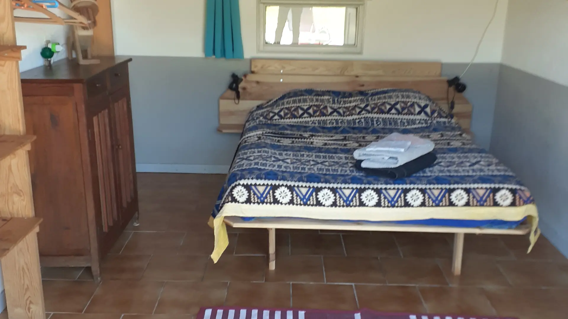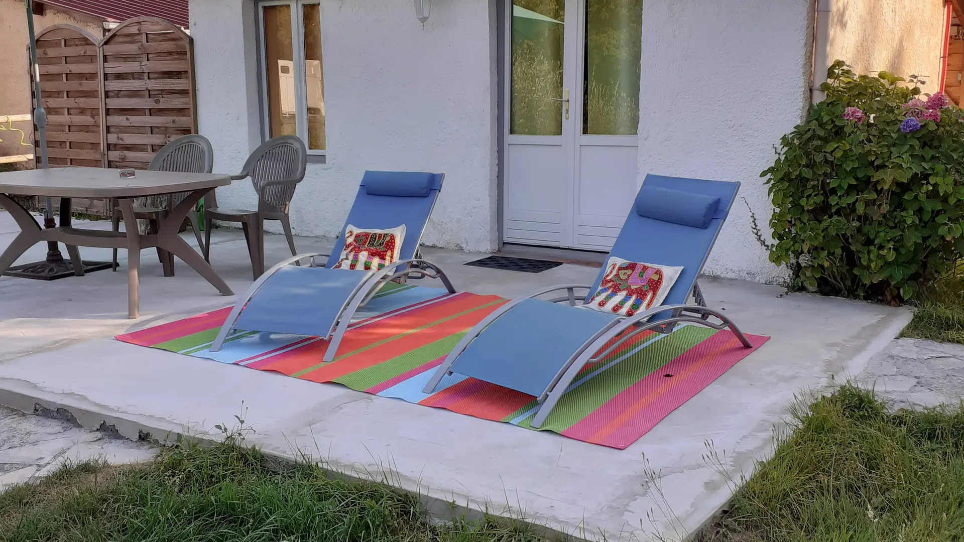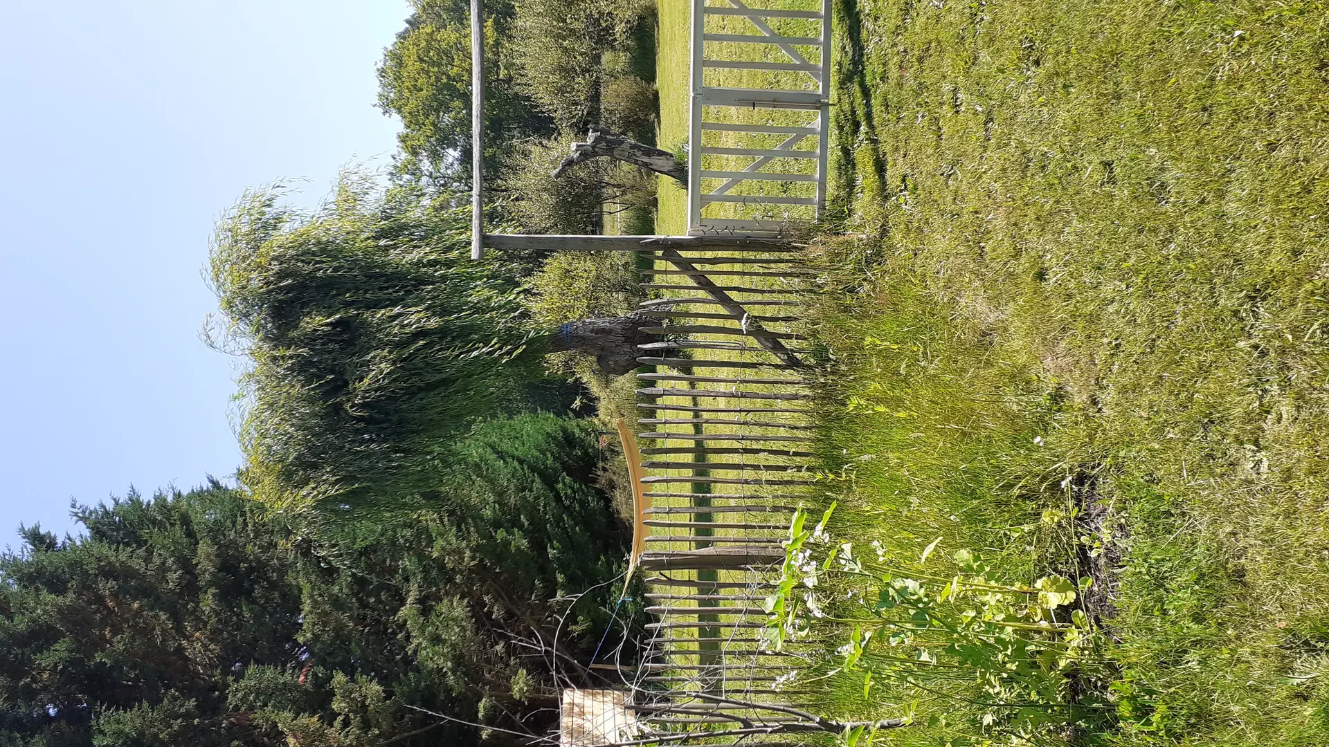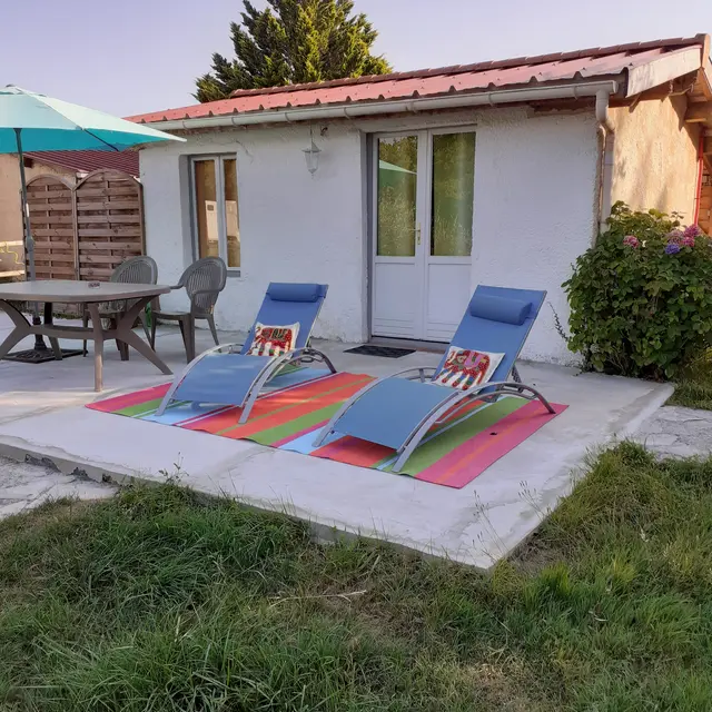 In einer ländlichen Umgebung, in ruhiger Lage, innerhalb des Anwesens, separates Häuschen mit ausgestatteter Terrasse (Tisch und Stühle für draußen, Liegestühle, BBQ, Sonnenschirm), geschlossener Garten, Blick auf die Wiesen und den Wald, Wohnraum mit Doppelbett, ausgestattete, separate Küche, Bad/WC, geschlossenes Vordach für Fahrräder oder Surfbretter.